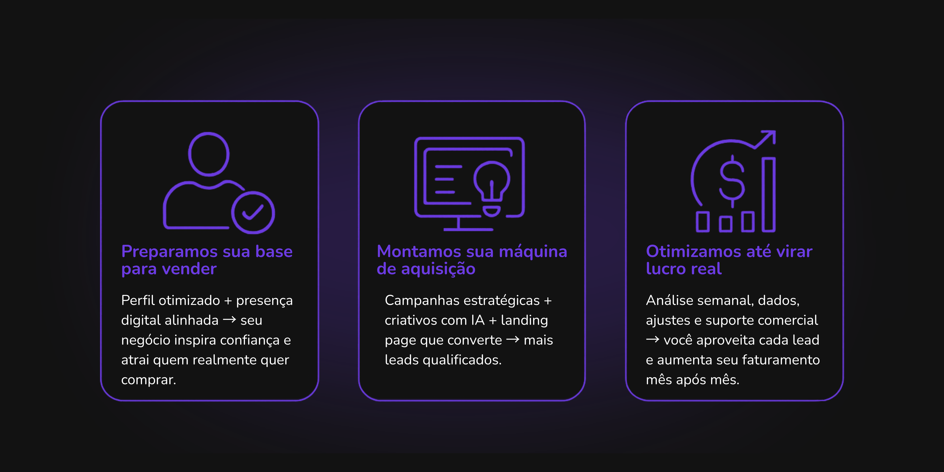 Da preparação do perfil ao atendimento final do lead: criamos todo o sistema para atrair clientes qualificados e converter cada oportunidade em receita.